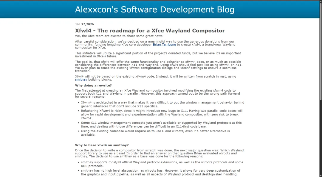 Xfce团队近日宣布一项激动人心的新计划:利用社区慷慨捐款,资助核心开发者Brian Tarricone从零打造“xfwl4”——一款专为Xfce设计的全新Wayland合成器!这标志着经典桌面环境Xfce正式拥抱未来显示协议Wayland,目标是让用户体验丝滑过渡,仿佛还在用老将xfwm4。