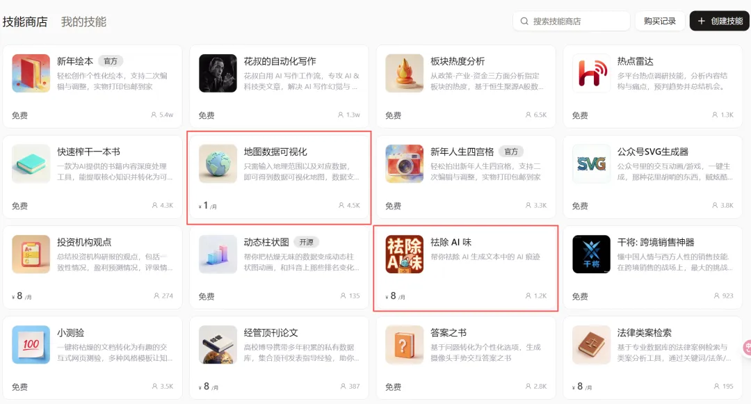打开 Coze,找到左侧技能商店,点击右上角的+创建技能按钮。