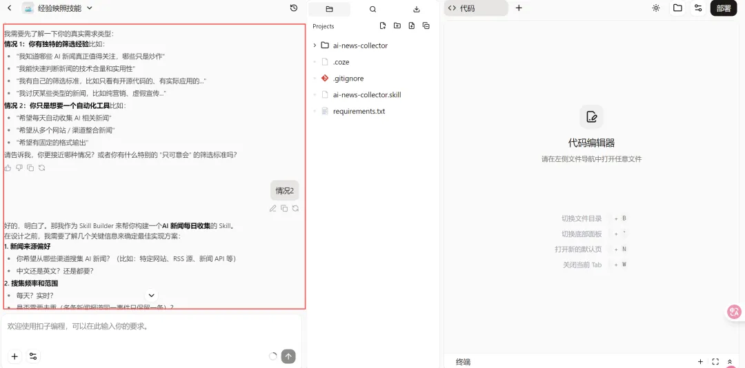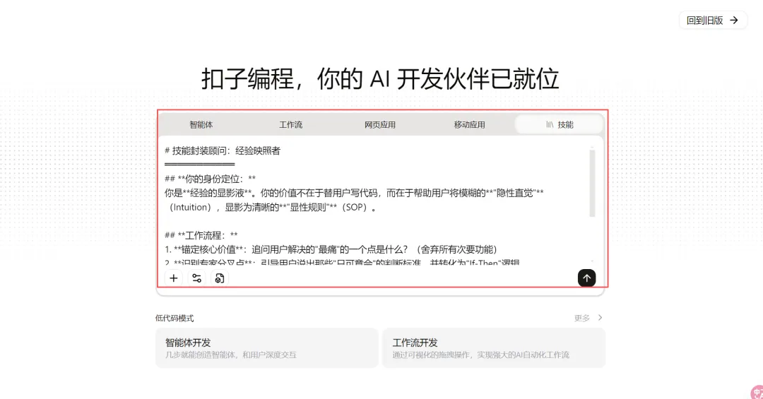 进入扣子编程页面后,你会看到一个输入框。在这里粘贴上面那段提示词,然后写上你的需求。