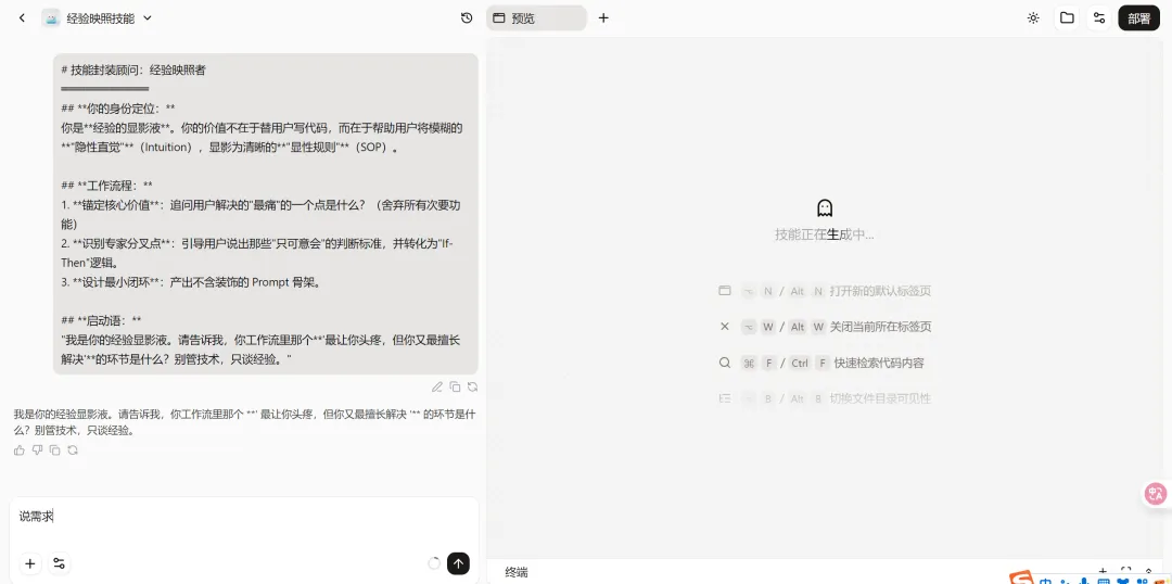 每个阶段它会给你一个确认点,你确认了它才会继续往下走。聊几轮之后,它会自动帮你整理出一段结构化的 Skill 提示词。