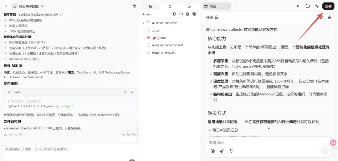 没问题的话,点击右上角的部署按钮,你的技能就上线了。