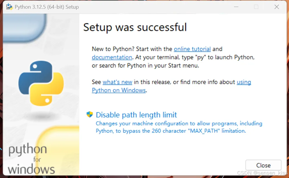 这里Diable path length limit是为了防止文件路径名字过长而取消路径长度限制,建议不要点击,直接点击Close就好