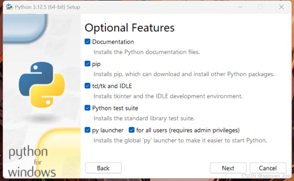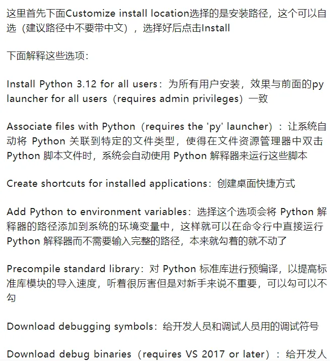 py launcher for all users(requires admin privileges):首先py launcher可以保证用户在命令行里使用python命令启动python,而后半句for all users是询问是否为电脑上的所有用户安装上python,而这一步需要管理员权限对应的是括号里的那句话