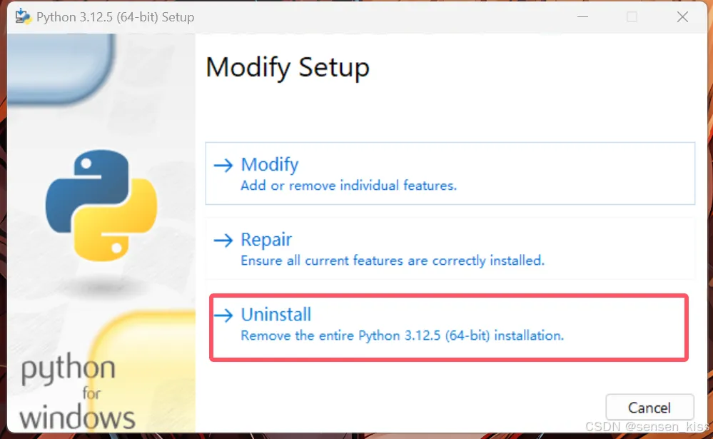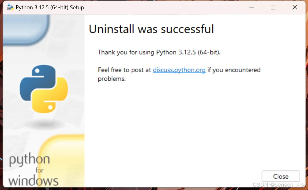 出现如下界面表示卸载成功,然后你可以回到上一步安装Python中重新安装Python,在Python安装的第一页点击Add python.exe to PATH