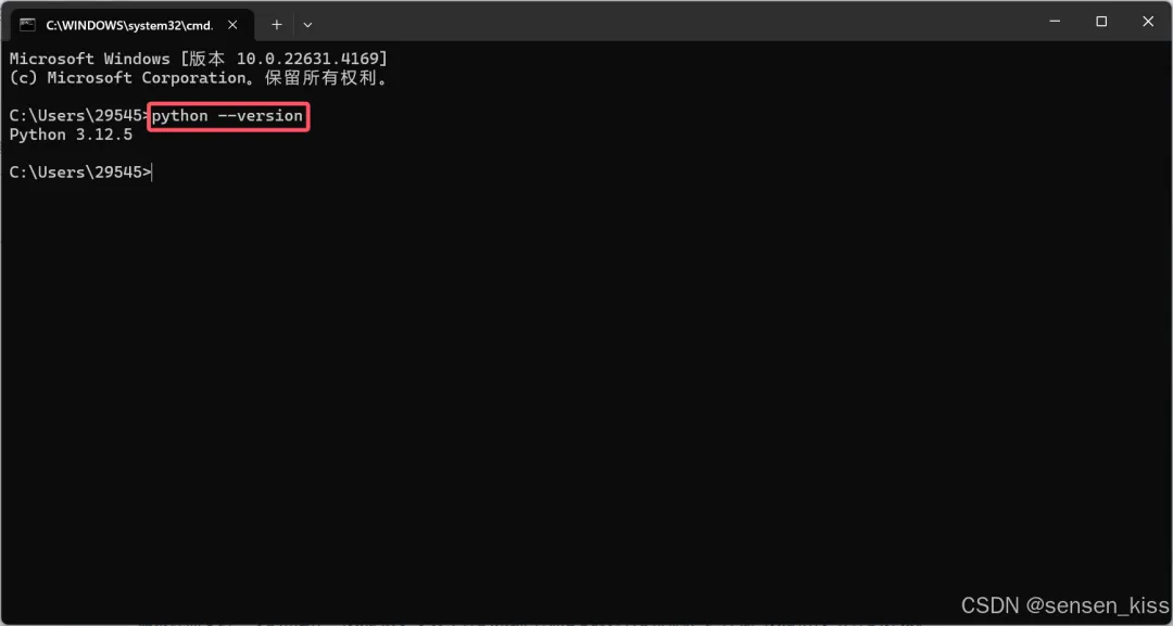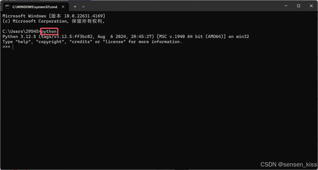 然后在命令行里输入python,结果如图类似即可,由于我安装的是Python 3.12.5版本所以出现的就是Python 3.12.5,如果你是其他版本就是对应版本