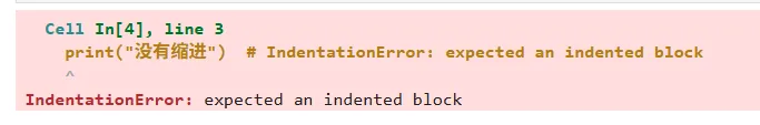 # 错误示例(会导致缩进错误)if True:print("没有缩进") # IndentationError: expected an indented block