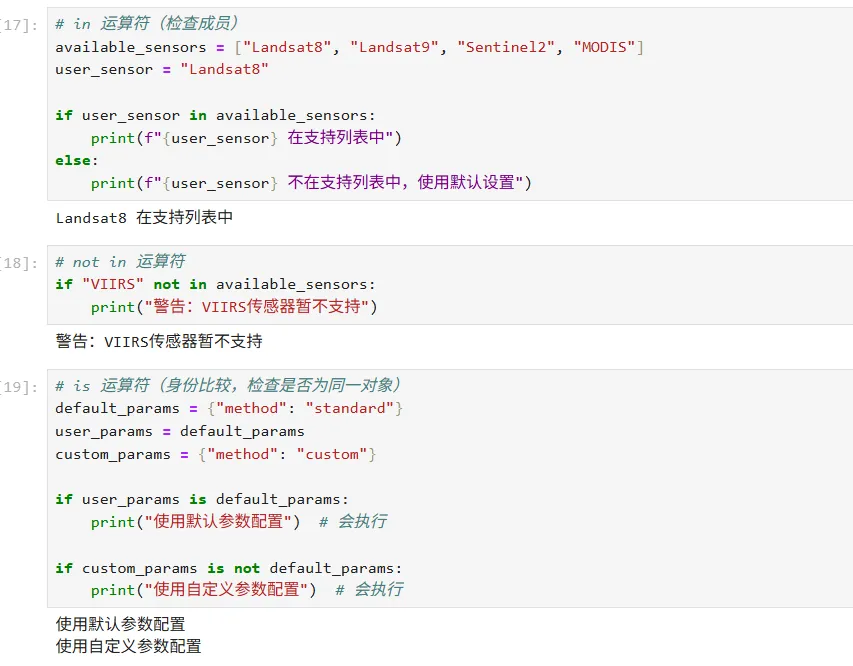 # in 运算符(检查成员)available_sensors = ["Landsat8", "Landsat9", "Sentinel2", "MODIS"]user_sensor = "Landsat8"if user_sensor in available_sensors:print(f"{user_sensor} 在支持列表中")else:print(f"{user_sensor} 不在支持列表中,使用默认设置")