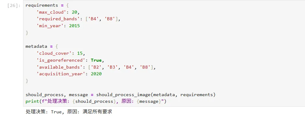 requirements = {'max_cloud': 20,'required_bands': ['B4', 'B8'],'min_year': 2015}metadata = {'cloud_cover': 15,'is_georeferenced': True,'available_bands': ['B2', 'B3', 'B4', 'B8'],'acquisition_year': 2020}should_process, message = should_process_image(metadata, requirements)print(f"处理决策: {should_process}, 原因: {message}")