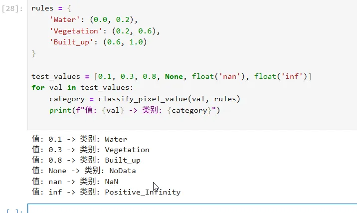 rules = {'Water': (0.0, 0.2),'Vegetation': (0.2, 0.6),'Built_up': (0.6, 1.0)}test_values = [0.1, 0.3, 0.8, None, float('nan'), float('inf')]for val in test_values:category = classify_pixel_value(val, rules)print(f"值: {val} -> 类别: {category}")
