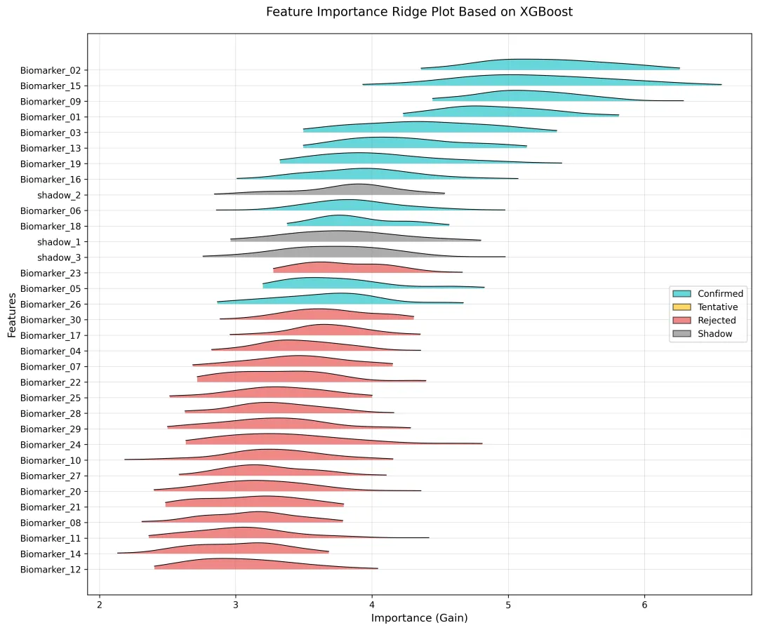 代码以 XGBoost 算法为例,通过多随机种子训练模型获取特征增益型重要性,引入影子特征作参照并按分位数将特征分类,再经核密度估计拟合重要性分布,最终绘制山脊图可视化特征重要性差异。实现过程为先生成或读取模拟数据,自动识别特征与目标列,多轮训练提取并处理重要性数据,完成特征分类后转换数据格式,基于核密度估计绘制并保存可视化山脊图,实现特征重要性的量化与可视化分析。
