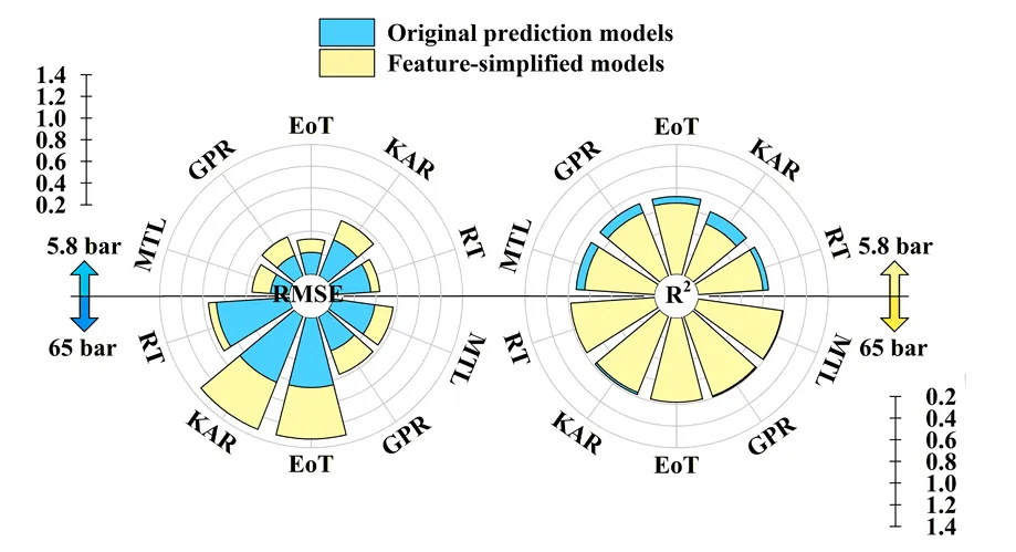 # ==========================================# 4. 组合画布 (Assembly)# ==========================================fig = plt.figure(figsize=(12, 6))# --- 左图:RMSE ---ax1 = fig.add_subplot(121, projection='polar')# RMSE 最大值约为 1.4plot_mirror_radial(ax1, rmse_data, "RMSE", max_val=1.4, metric_type='RMSE')# 手动添加左侧刻度尺 (Scale Bar)# 这是一个 trick:在极坐标外画一个普通的 axes 用于显示刻度ax_scale = fig.add_axes([0.05, 0.4, 0.02, 0.4]) # [left, bottom, width, height]ax_scale.axis('off')ax_scale.set_ylim(0, 1.4)ax_scale.plot([0, 0], [0, 1.4], 'k-', lw=1)# 画刻度线for y in np.arange(0.2, 1.5, 0.2): ax_scale.plot([-0.5, 0], [y, y], 'k-', lw=1) ax_scale.text(-1.0, y, f'{y:.1f}', va='center', ha='right', fontsize=10)# --- 右图:R2 ---ax2 = fig.add_subplot(122, projection='polar')# R2 最大值是 1.0 (或1.2以便美观)plot_mirror_radial(ax2, r2_data, "$R^2$", max_val=1.2, metric_type='R2')# --- 注入灵魂:添加压力指示箭头 ---# 这是一个纯几何装饰,用 fig.text 或 annotatedef add_pressure_arrow(x_pos, y_pos): # 向上箭头 (5.8 bar) plt.annotate('5.8 bar', xy=(x_pos, y_pos + 0.15), xytext=(x_pos, y_pos + 0.25), arrowprops=dict(facecolor='#00BFFF', shrink=0.05), ha='center', fontsize=12, fontweight='bold') # 向下箭头 (65 bar) plt.annotate('65 bar', xy=(x_pos, y_pos - 0.15), xytext=(x_pos, y_pos - 0.25), arrowprops=dict(facecolor='#00BFFF', shrink=0.05), ha='center', fontsize=12, fontweight='bold') # 分割线 plt.plot([x_pos-0.05, x_pos+0.05], [y_pos, y_pos], 'k-', transform=fig.transFigure)# 在两个图中间添加指示# 这里为了简化,我们假设读者能看懂上下半球fig.text(0.5, 0.95, "Original vs Feature-simplified Models", ha='center', fontsize=14, fontweight='bold')# 添加图例import matplotlib.patches as mpatchesblue_patch = mpatches.Patch(color='#33CCFF', label='Original prediction models')yellow_patch = mpatches.Patch(color='#FFFF99', label='Feature-simplified models')fig.legend(handles=[blue_patch, yellow_patch], loc='upper center', bbox_to_anchor=(0.5, 0.92), ncol=2, frameon=False)plt.tight_layout()plt.show()
