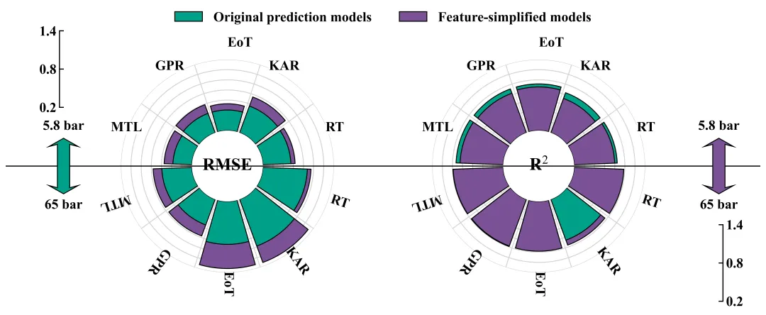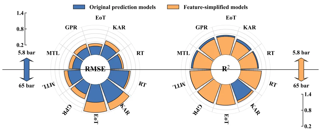 左图 (RMSE):你看那些黄色的柱子(简化模型)和蓝色的柱子(原始模型)高度差不差?如果在误差图里,黄色柱子没有比蓝色高太多,说明简化模型虽然特征少,但精度没掉多少。