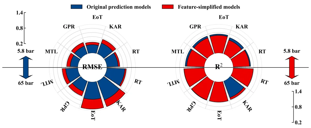 # ==========================================# 2. 数据准备 (Data Engineering)# ==========================================# 模拟论文中的真实数据趋势 (参考原文 Table 4 & 6)# Models: [MTL, GPR, EoT, KAR, RT]models = ['MTL', 'GPR', 'EoT', 'KAR', 'RT']num_vars = len(models)# 角度计算:我们将圆分为 5 份?不对!# 观察原图,上下半球各排列了 5 个模型。# 所以我们需要把圆切成 12 份(或者更多),留出水平线的空隙。# 这里的策略是:上半球用 0-180度,下半球用 180-360度。# 每个半球放 5 个扇区。# 计算每个扇区的角度宽度theta_width = np.pi / (num_vars + 1) # 加1是为了留一点边距# 上半球角度 (20度到160度之间分布)angles_top = np.linspace(np.deg2rad(20), np.deg2rad(160), num_vars)# 下半球角度 (200度到340度之间分布)angles_bottom = np.linspace(np.deg2rad(200), np.deg2rad(340), num_vars)# 构造数据 (Data Construction)# 格式: {'Model': [Original_Val, Simplified_Val]}# RMSE 数据 (左图)rmse_data = { '5.8bar': { # 上半球 'MTL': [0.375, 0.548], 'GPR': [0.406, 0.589], 'EoT': [0.405, 0.528], 'KAR': [0.560, 0.751], 'RT': [0.553, 0.636] }, '65bar': { # 下半球 'MTL': [0.594, 0.765], 'GPR': [0.537, 0.768], 'EoT': [0.594, 1.321], # EoT simplified 误差较大 'KAR': [0.857, 1.326], 'RT': [0.980, 0.950] }}# R2 数据 (右图) - 仅作示例结构,逻辑同上r2_data = { '5.8bar': { 'MTL': [0.930, 0.851], 'GPR': [0.920, 0.830], 'EoT': [0.920, 0.860], 'KAR': [0.840, 0.720], 'RT': [0.850, 0.800] }, '65bar': { 'MTL': [0.992, 0.987], 'GPR': [0.990, 0.980], 'EoT': [0.980, 0.980], 'KAR': [0.980, 0.960], 'RT': [0.878, 0.980] }}print("✅ 数据结构已构建:准备映射到极坐标系...")