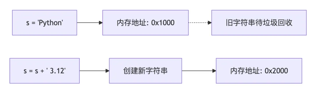 s = "Python"print(id(s)) # 字符串对象的内存地址s = s + " 3.12"# 创建新字符串print(id(s)) # 新地址,与之前不同