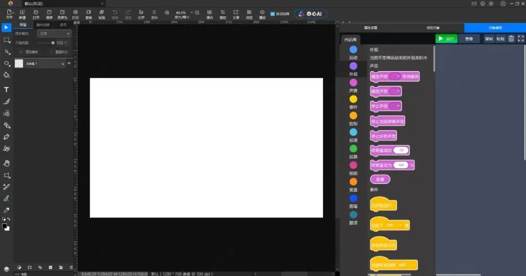 悟空编程不限制舞台区画布大小支持各种画布尺寸、分辨率、颜色模式,