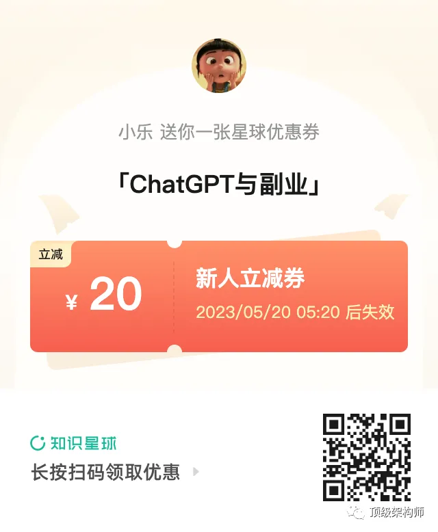 昨天发的20个优惠卷已经用完,今天我又放出来了100个20元优惠卷,相当于99元就能加入。 早就是优势!对了现在加入还送一个ChatGPT独享帐号。 名额有限,先到先得: