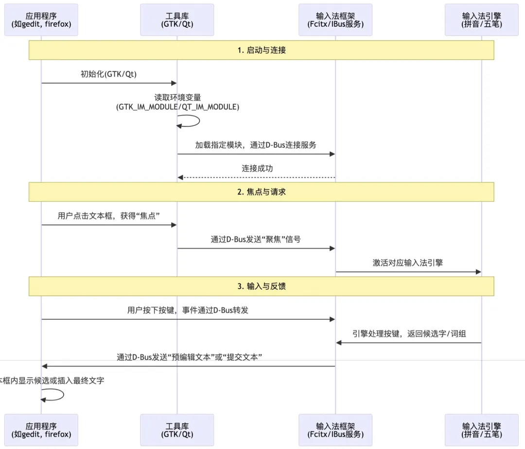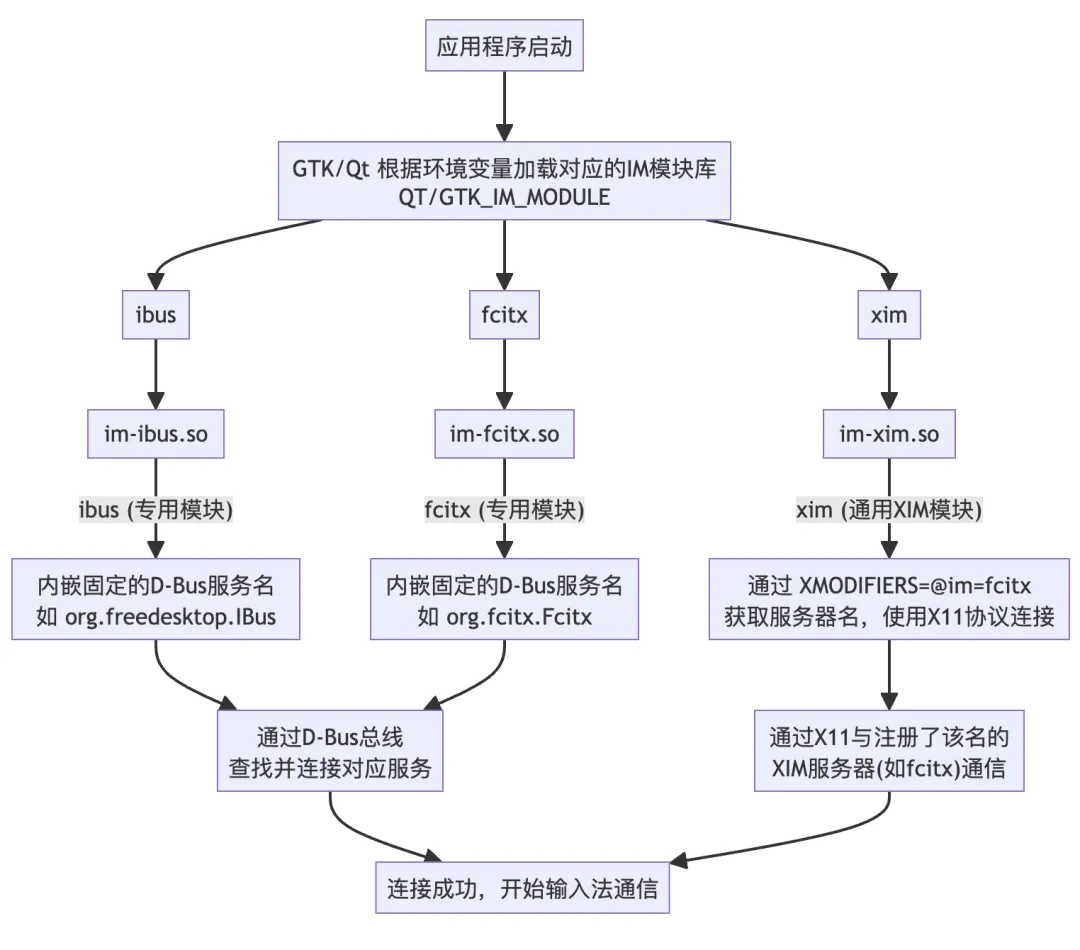 fcitx 模块 -> D-Bus -> Fcitx 输入法服务。 - 本质:应用通过各自工具集的原生输入法模块,直接与Fcitx的D-Bus服务通信。这是性能最佳、功能最全的方式,应该作为标准配置。