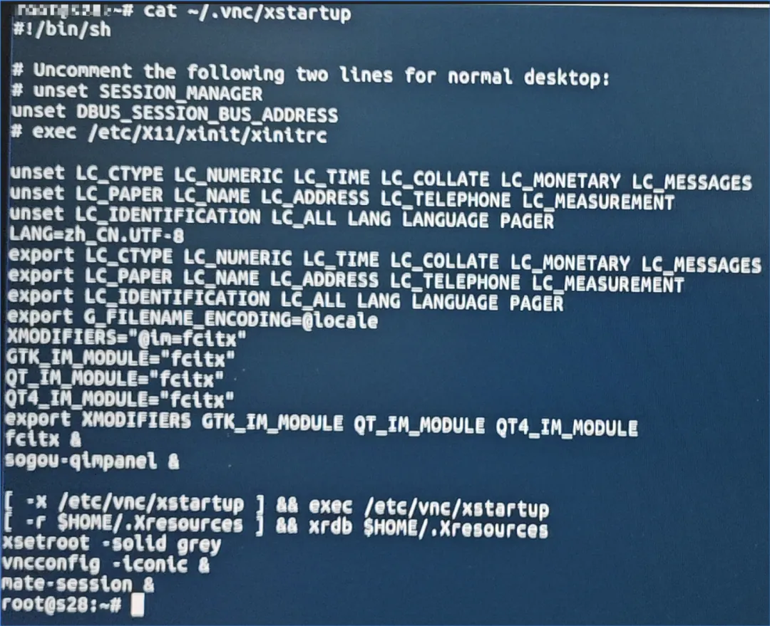 # cat ~/.vnc/xstartup#!/bin/shexport XKL_XMODMAP_DISABLE=1unset SESSION_MANAGERunset DBUS_SESSION_BUS_ADDRESSexport GTK_IM_MODULE=fcitxexport XMODIFIERS=@im=fcitxexport QT_IM_MODULE=fcitx[ -x /etc/vnc/xstartup ] && exec /etc/vnc/xstartup[ -r $HOME/.Xresources ] && xrdb $HOME/.Xresourcesxsetroot -solid greyvncconfig -iconic &ukui-session &fcitx -d