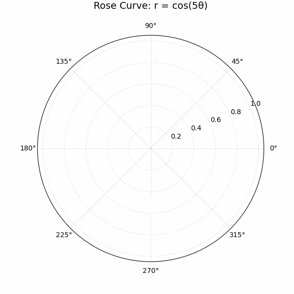 import numpy as npimport matplotlib.pyplot as pltfrom matplotlib.animation import FuncAnimation, PillowWriter# ===== 配置参数 =====k = 5 # 花瓣数量控制:整数→2k瓣,半整数→k瓣frames = 100 # 动画帧数theta_max = 2 * np.pi# ===== 创建图形 =====fig, ax = plt.subplots(subplot_kw={'projection': 'polar'}, figsize=(6, 6))ax.set_title(f'Rose Curve: r = cos({k}θ)', fontsize=14, pad=20)ax.grid(alpha=0.3)line, = ax.plot([], [], 'r-', linewidth=2.5) # 红色曲线# ===== 动画更新函数 =====def animate(frame):theta = np.linspace(0, theta_max * frame / frames, 200)r = np.cos(k * theta) # 核心公式line.set_data(theta, r)return line,# ===== 创建动画 =====anim = FuncAnimation(fig, animate, frames=frames, interval=50, blit=True)# ===== 保存为GIF =====writer = PillowWriter(fps=20) # 20帧/秒,流畅度最佳anim.save('rose_curve.gif', writer=writer, dpi=100)print("saved as 'rose_curve.gif'")plt.tight_layout()plt.show()