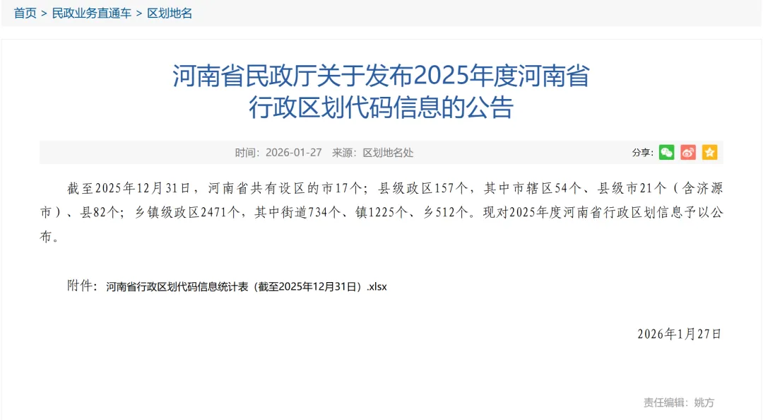 根据2025年新发布的 《行政区划代码管理办法》第十六条规定,省、自治区、直辖市人民政府民政部门应当在每年1月和7月通过民政部门网站发布截至上个月末本地区乡级行政区划建制的行政区划代码信息。2026年1月27日,河南省民政厅官网发布《河南省民政厅关于发布2025年度河南省行政区划代码信息的公告》。