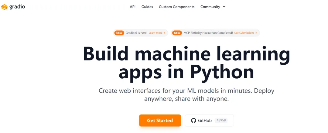 Gradio是目前机器学习和数据科学领域最流行、最易上手的 Python Web UI 框架之一。简单来说,它的核心使命是:让你用极短的 Python 代码(通常只需几行),瞬间为你的机器学习模型构建一个可视化的演示界面。它特别适合用于快速原型设计、向团队/客户展示模型效果,或者在 Hugging Face Spaces 上托管 Demo。