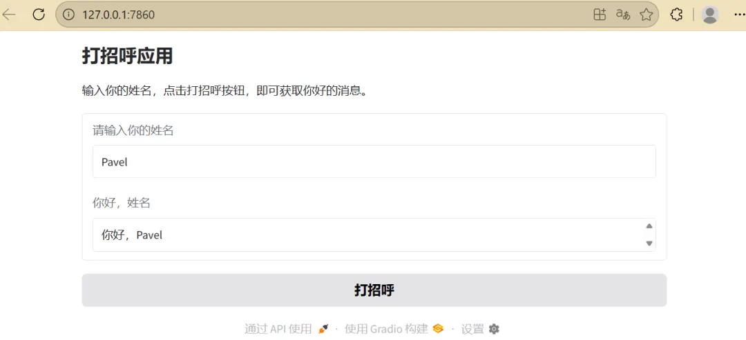 import gradio as grdef hello(name): return "你好," + name# Inferface模式# demo = gr.Interface(# fn=hello,# inputs=['text'],# outputs="text",# )# Blocks模式with gr.Blocks() as demo: name = gr.Textbox(label="请输入你的姓名") output = gr.Textbox(label="你好,姓名") greet_btn = gr.Button("打招呼") greet_btn.click(fn=hello, inputs=name, outputs=output)demo.launch(share=True)