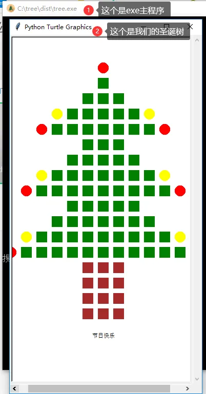 import turtlescreen = turtle.Screen()screen.setup(375, 700)circle = turtle.Turtle()circle.shape('circle')circle.color('red')circle.speed('fastest')circle.up()square = turtle.Turtle()square.shape('square')square.color('green')square.speed('fastest')square.up()circle.goto(0, 280)circle.stamp()k = 0for i inrange(1, 13): y = 30 * ifor j inrange(i - k): x = 30 * j square.goto(x, -y + 280) square.stamp() square.goto(-x, -y + 280) square.stamp()if i % 4 == 0: x = 30 * (j + 1) circle.color('red') circle.goto(-x, -y + 280) circle.stamp() circle.goto(x, -y + 280) circle.stamp() k += 3if i % 4 == 3: x = 30 * (j + 1) circle.color('yellow') circle.goto(-x, -y + 280) circle.stamp() circle.goto(x, -y + 280) circle.stamp()square.color('brown')for i inrange(13, 17): y = 30 * ifor j inrange(2): x = 30 * j square.goto(x, -y + 280) square.stamp() square.goto(-x, -y + 280) square.stamp()turtle.up()turtle.goto(-20,-250)turtle.write("节日快乐")# 这里可以送上你的祝福turtle.hideturtle()turtle.done()