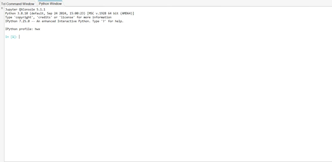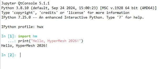 这个新窗口是你未来与 HyperMesh 交互的核心枢纽。当你第一次打开它,你会看到 In [1]: 的提示符。