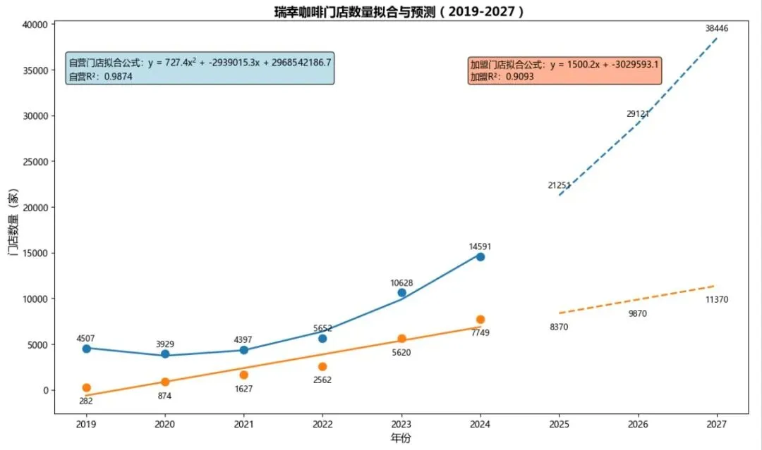 years_original = np.array([2019, 2020, 2021, 2022, 2023, 2024])self_operated = np.array([4507, 3929, 4397, 5652, 10628, 14591]) # 自营franchise = np.array([282, 874, 1627, 2562, 5620, 7749]) # 加盟predict_years = np.array([2025, 2026, 2027])all_years = np.concatenate([years_original, predict_years])
