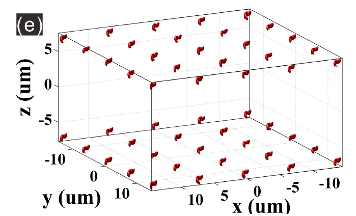 在此基础上,进一步引入多焦点结构与手性相位调制,成为提升三维光场自由度的关键一步。通过在强聚焦条件下对相位与拓扑数进行协同设计,不仅可以在三维空间内同时构建多个焦点,还能赋予每个焦点可控的手性与拓扑特性,从而实现更加灵活、功能更丰富的光束调制方案。