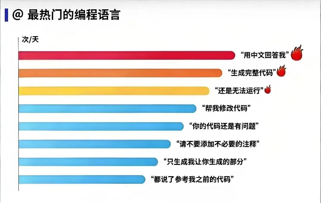 他看着群里刷屏的同款指令,突然反应过来 —— 图片里那根根彩色进度条,哪里是什么 “编程语言”,明明是当代程序员和 AI 斗智斗勇的 “血泪史”。这些带着火焰标的指令,就像一把把钥匙,打开了程序员和 AI 之间的默契。