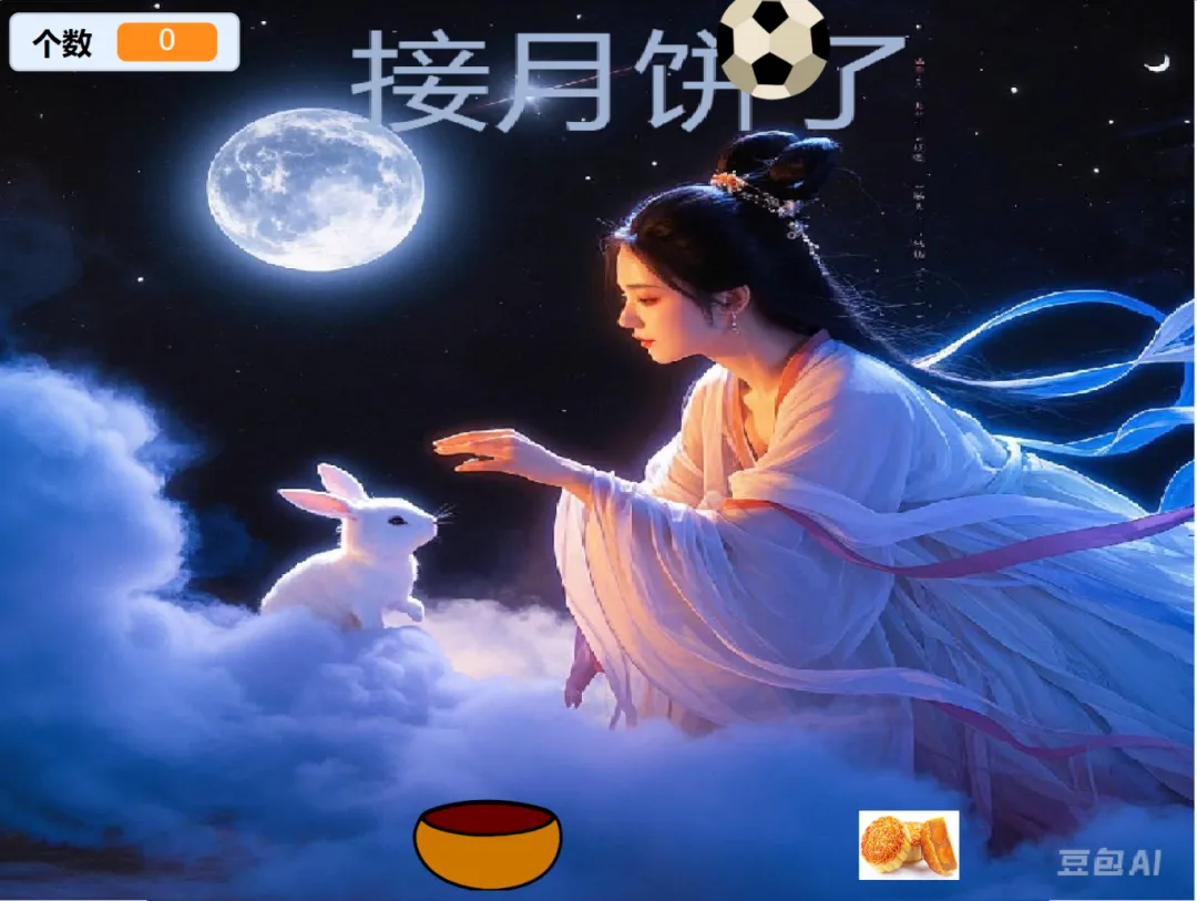 这个作品设计的是“嫦娥六号”月球探测器在可能遭到陨石下落伤害情况下采集月壤的任务。当“开始”被点击,出现平常状态的月球场景,“嫦娥六号”月球探测车会出现在舞台左下方。这时月球车会提示选择游戏难度:A是简单模式,B是困难模式。可以在出现的对话框里输入A或B进行选择。