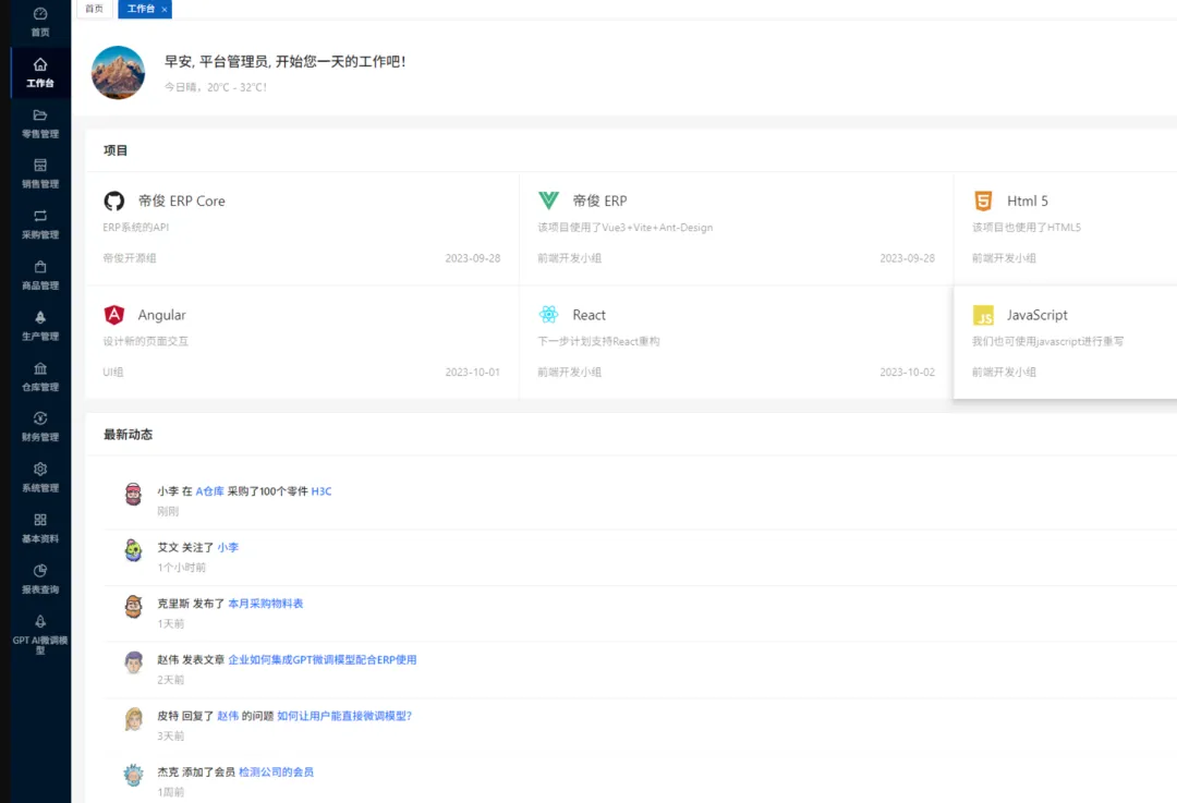 帝俊ERP在继承传统ERP核心模块的基础上,通过集成GPT大模型及DeepSeek等扩展能力,构建了“业务管理+智能交互”的双层架构,具体功能如下: