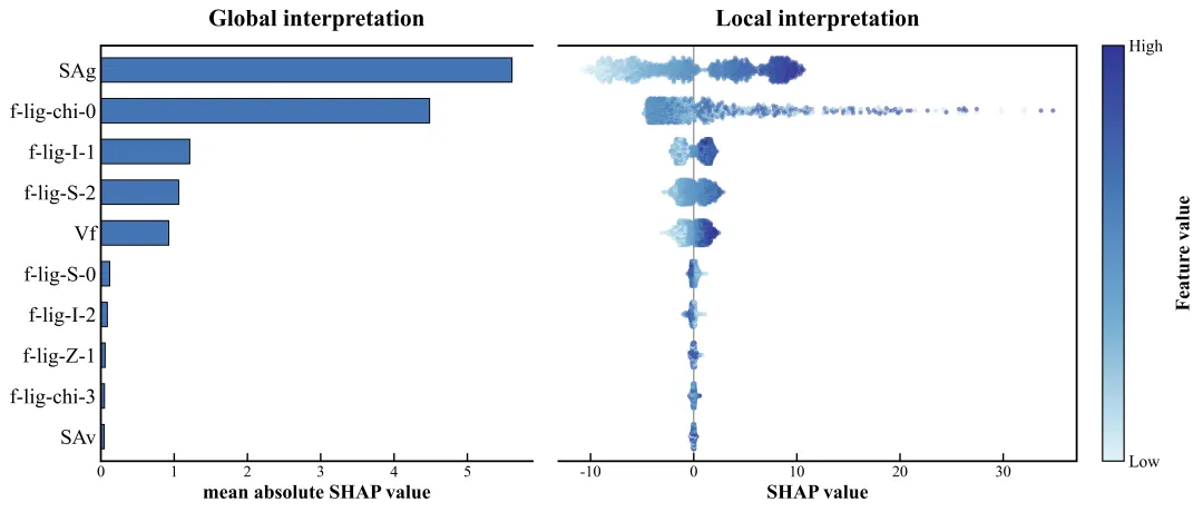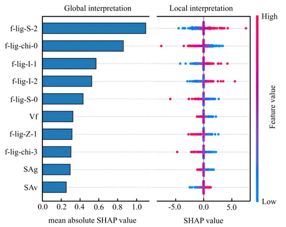 右图趋势:看 f-lig-S-2 对应的右侧散点。红点(特征值高)主要分布在 0 线右侧(SHAP > 0),蓝点(特征值低)在左侧。这意味着:该特征数值越大,越能提升甲烷吸附量(正相关) 。