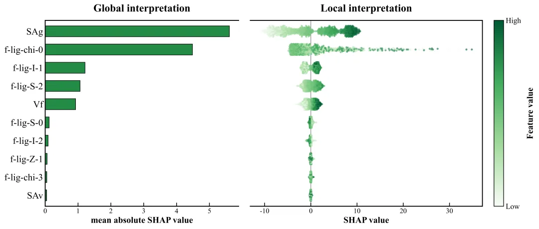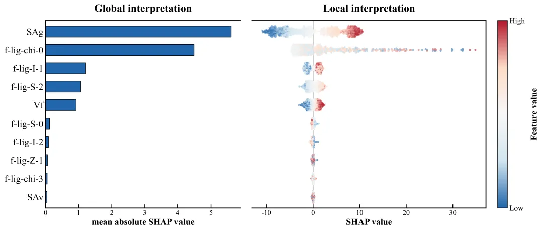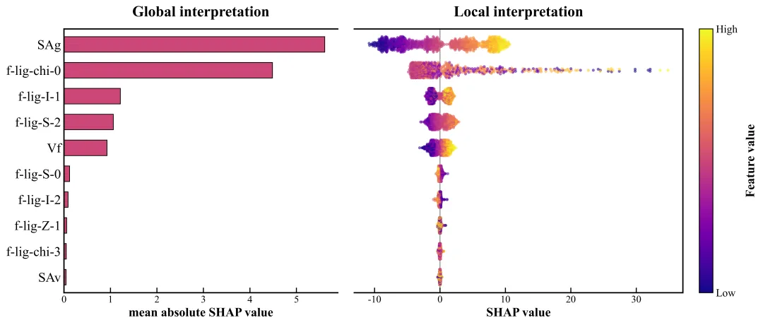 反直觉现象:看第五个特征 Vf (孔隙率相关)。它的红点(高 Vf)竟然分布在左侧(SHAP < 0)!这说明在低压下,过大的孔隙率反而可能不利于吸附(或者说某种特定范围更优),这与我们通常认为的“孔越大吸附越多”形成了有趣的科学反差 。