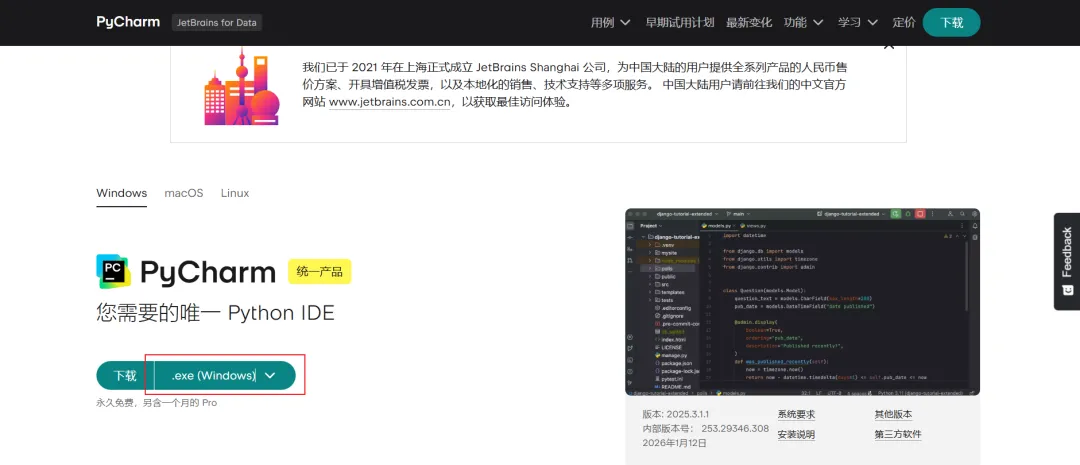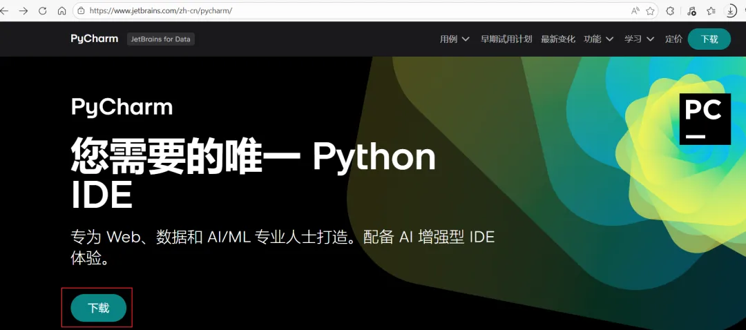 打开 Pycharm官网下载页面:https://www.jetbrains.com/zh-cn/pycharm/