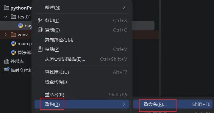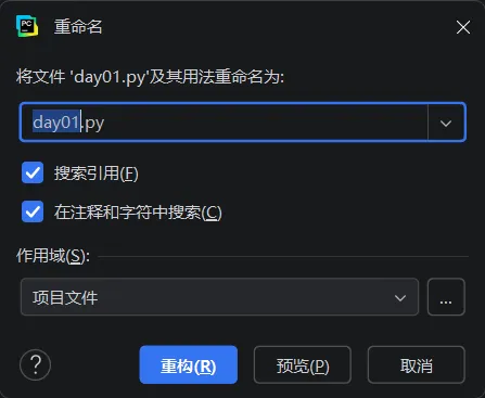 选中希望重命名的文件/文件夹,右键,依次点击【重构】、【重命名】、【重构】完成重命名