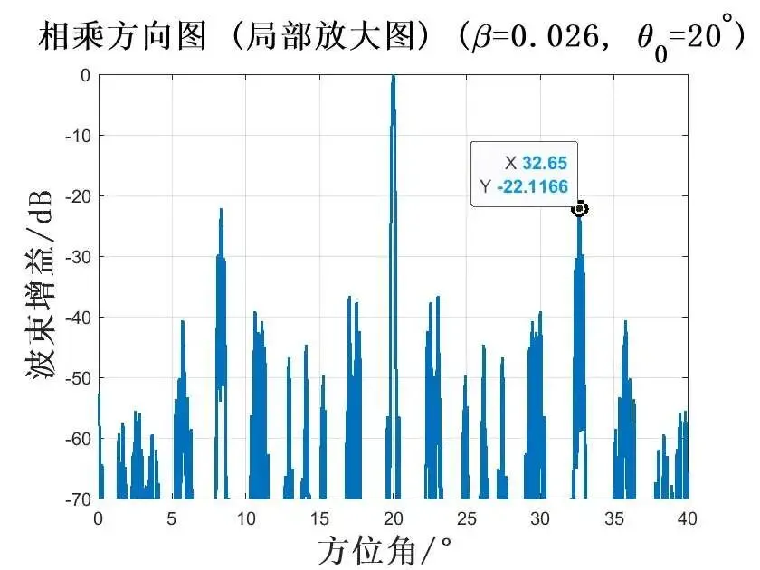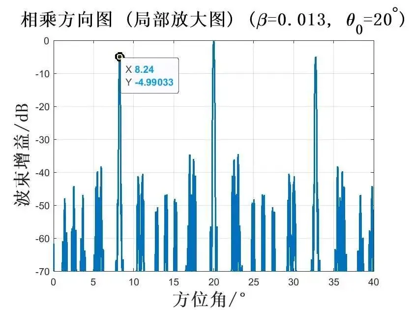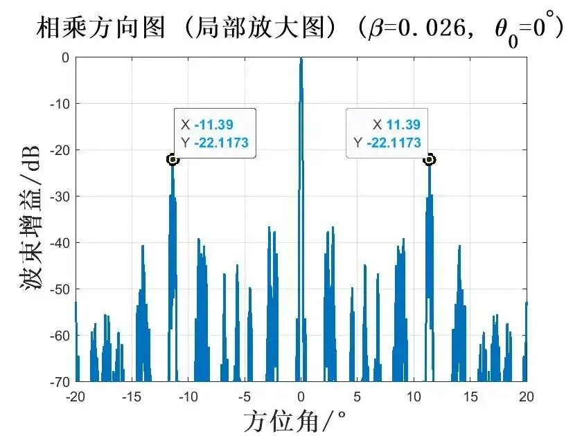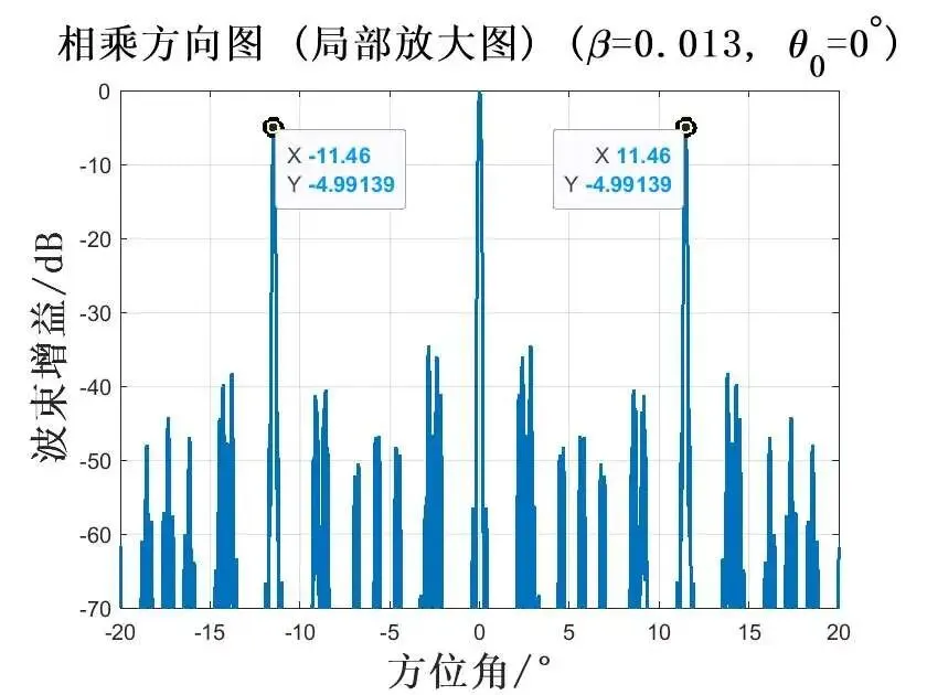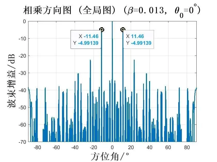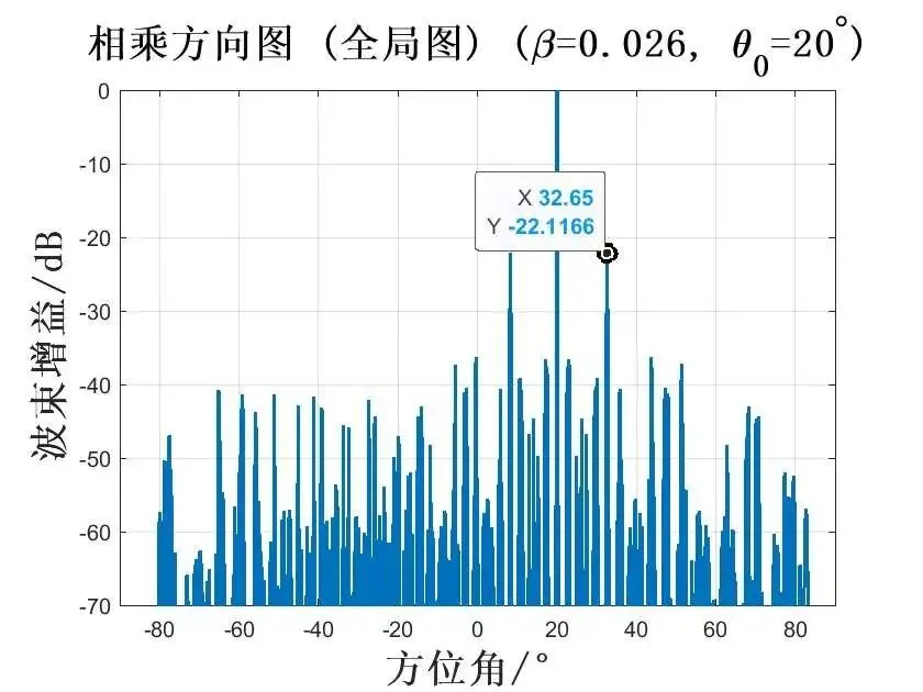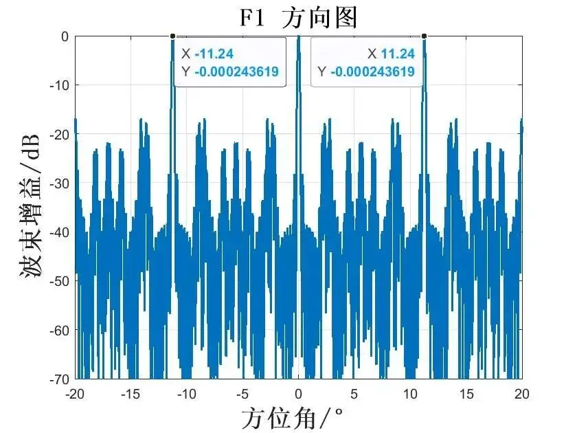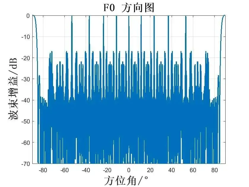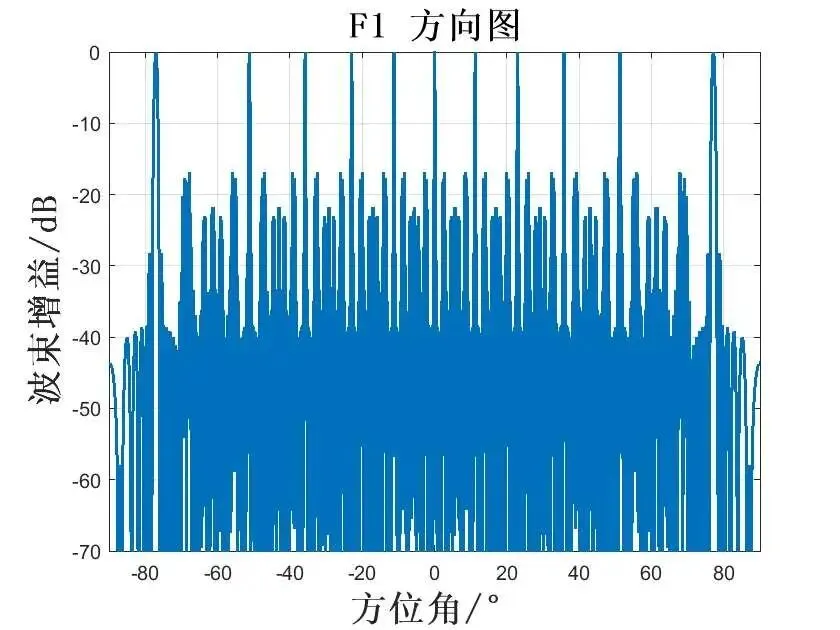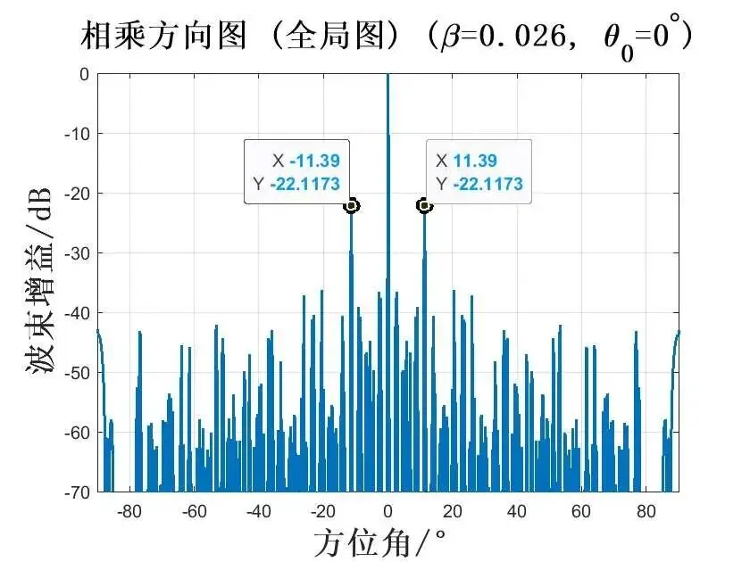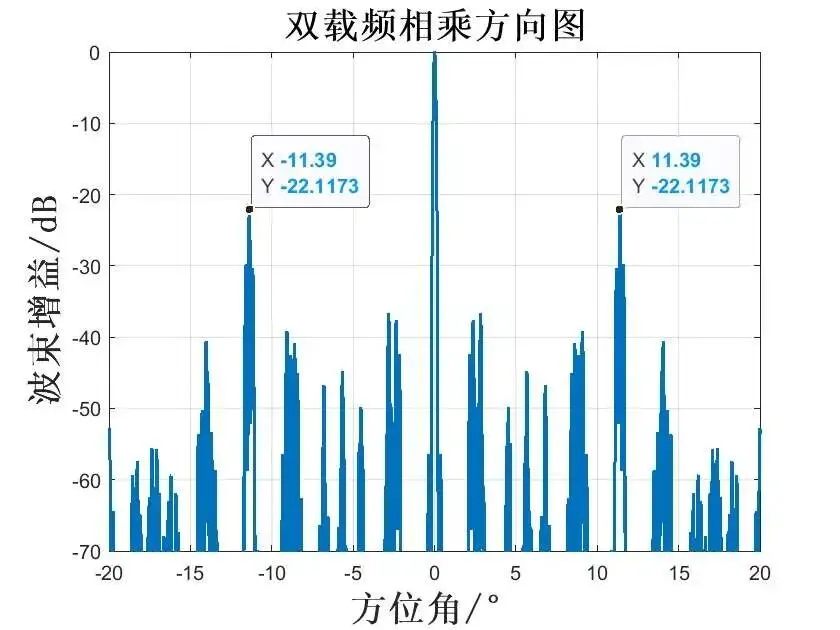 下面通过仿真得到,双载频相乘得到的方向图,可以看到很好的抑制了栅瓣。