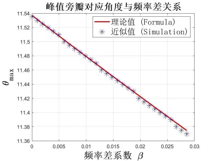 两组不同载频对应的方向图相乘后得到方向图峰值旁瓣对应角度与频率差的关系曲线(近似值与理论值),如图所示。