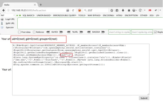 4、通过“Attack”操作机的浏览器访问http://靶机ip:8080/hello.action,可以看到一个提交页面