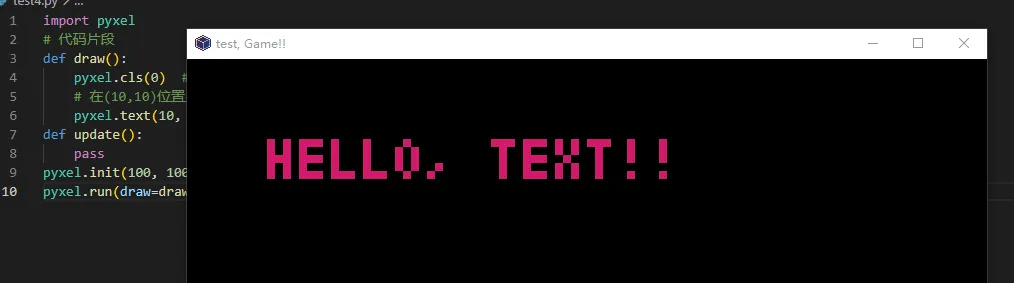 在上一篇内容中,我们使用Pyxel Editor绘制资源,并加载。今天我们来在游戏界面中加上文字的显示,比如得分,提示信息等内容。在Pyxel中文字的显示功能很简单,只需要一个函数就搞定pyxel.text()。首先我们看看它的参数说明col参数:文字的颜色值,pyxel内置了16种颜色,可以和Editor中对应让我们先来个简单的示例,在屏幕中显示红色的HELLO,WORLD# 代码片段def draw(self): pyxel.cls(0) # 清空屏幕,背景设为黑色 # 在(10,10)位置显示红色文字 pyxel.text(10, 10, "HELLO, TEXT!!", 7)