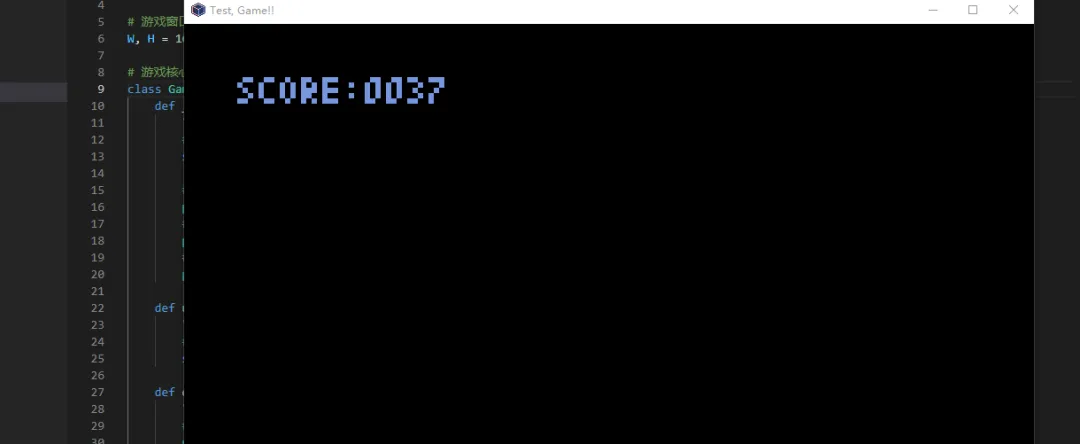 是不是很简单,我们来做个动态计分效果,单纯的数字并不美观,可以通过字符串格式化,让分数显示的更规范,比如固定4位,不足补0.代码如下:import pyxelimport mathimport random# 游戏窗口尺寸(宽160,高120)W, H = 160, 120 # 游戏核心类class Game: def __init__(self): """构造函数:初始化游戏""" # 初始化分数(新增) self.score = 0 # 初始化Pyxel窗口 pyxel.init(W, H, title="Hello, Pyxel!!") # 加载资源文件(可选,本文重点是文字,也可注释掉) pyxel.load("shooter.pyxres") # 启动游戏循环 pyxel.run(self.update, self.draw) def update(self): """更新逻辑:每帧更新分数""" # 每帧分数+1(模拟游戏得分,可根据实际逻辑修改) self.score += 1 def draw(self): """绘制逻辑:显示分数""" # 清空屏幕,背景为黑色 pyxel.cls(0) # 绘制格式化的分数(核心代码) pyxel.text( 10, 10, # 文字位置:屏幕左上角(10,10) "SCORE:{:04}".format(self.score), # 格式化分数为4位补零 12 # 文字颜色:亮红色(12是Pyxel的颜色码) )# 程序入口def main(): Game()if __name__ == "__main__": main()