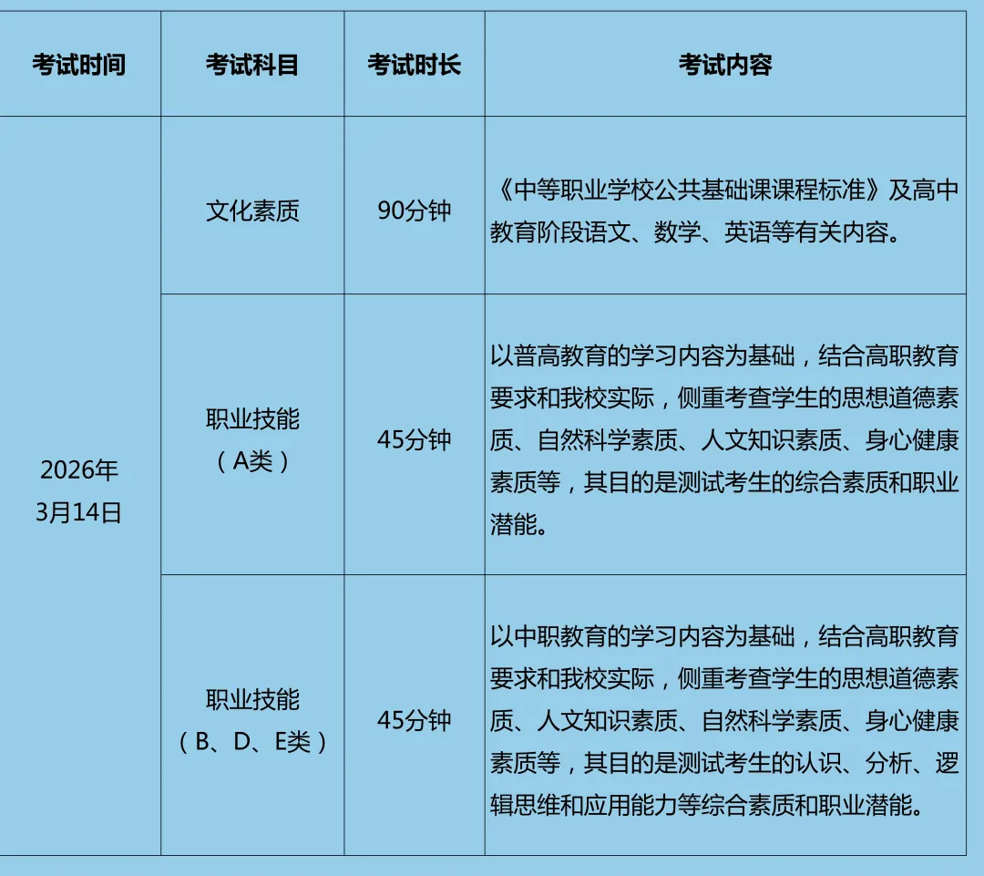 3.D类和E类考生免予文化素质测试。职业技能测试由学校组织,采取笔试方式进行,重点考察学生的职业适应性和职业技能,满分300分。