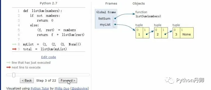 Python Tutor 是由 Philip Guo 开发的一个免费教育工具,可帮助学生攻克编程学习中的基础障碍,理解每一行源代码在程序执行时在计算机中的过程。通过这个工具,教师或学生可以直接在 Web 浏览器中编写 Python 代码,并逐步可视化地运行程序。如果你不知道代码在内存中是如何运行的,不妨把它拷贝到Tutor里可视化执行一遍,加深理解。
