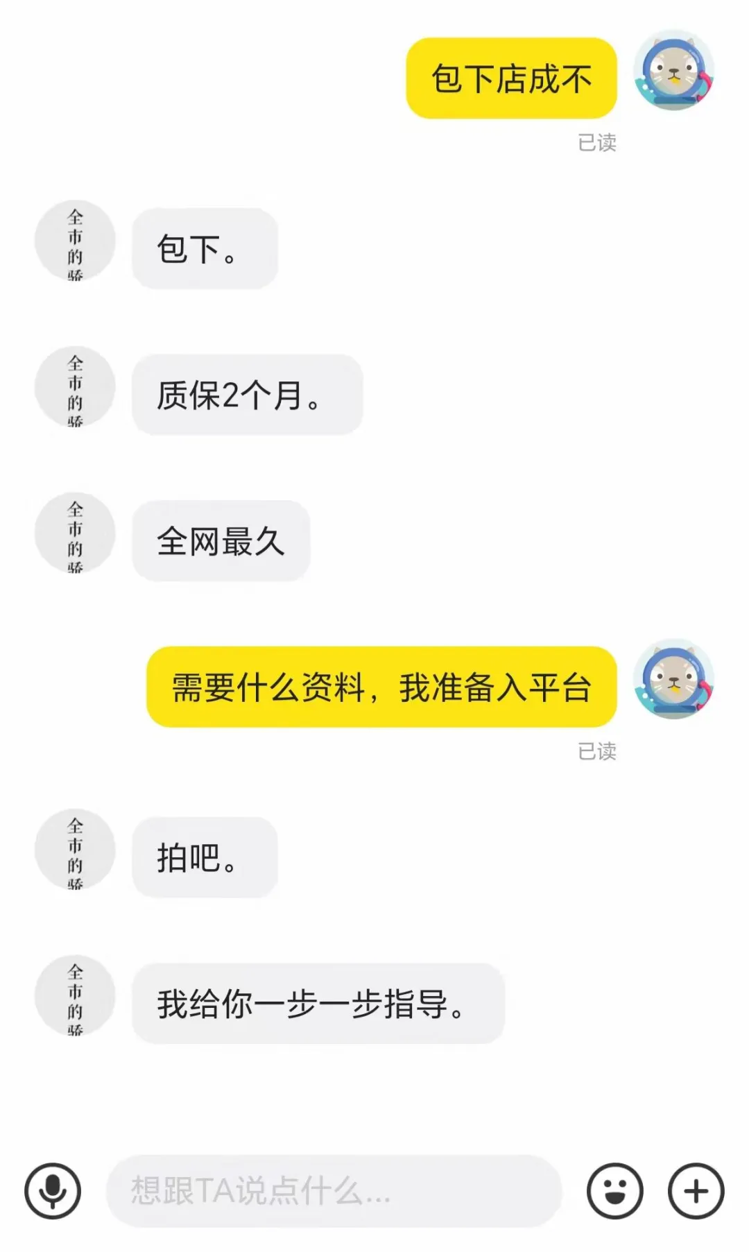 我立马私信他,问“包下店成不”,对方回复得特别干脆:“包下。质保2个月。全网最久。”我又问需要什么资料,准备入平台,他就说“拍吧,我给你一步一步指导”。现在回头看,当时的我真是太急功近利了,就想着499块钱不多,能快速开起店就值了,压根没多想他所谓的“包下店”,到底是用什么方法。