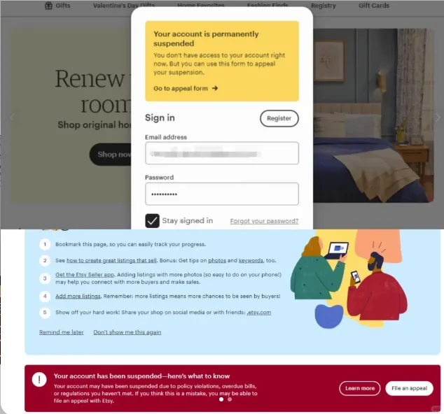 一旦被判定违规,不仅当前店铺会被封禁,同一套身份信息、邮箱、手机号,甚至同一台设备、同一个IP,以后再想通过正规方式入驻Etsy,都会变得非常困难,相当于直接被Etsy平台“拉黑”了。