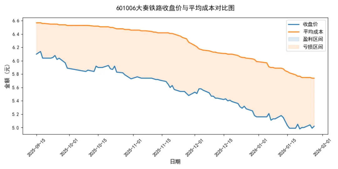 基于大秦铁路在2025年度跌跌不休,于是用AKshare数据库采集到股票90天的收盘价与平均成本数据,利用python绘制对比分析图。便于分析者从趋势形态、成本偏离、套牢压力、技术形态四个维度进行专业投资评价。分析图如下: