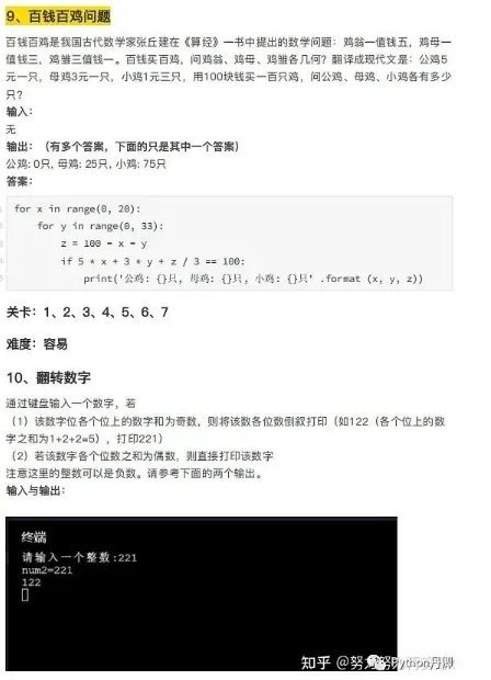 比如经典的 “百钱百鸡” 问题,通过二元循环遍历求解,帮你吃透数学逻辑与循环应用;“求列表绝对值最大数” 一题,巧用max()函数的key参数,快速掌握实用技巧。还有 100 以内偶数和、递归求年龄等基础题,能帮你巩固语法,稳步提升。