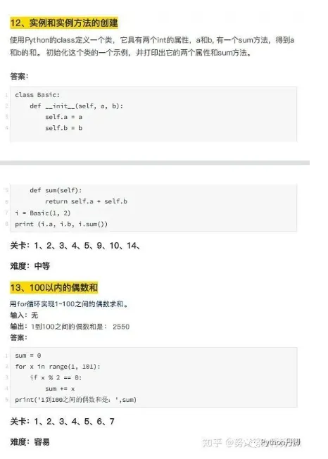 这份题库堪称 “全能练习册”,亮点十足:难度从易到难梯度排列,入门题帮你夯实语法基础,中等题锻炼逻辑思维,进阶题贴合面试高频考点,避免盲目刷题。题型覆盖循环判断、函数递归、类与对象、列表操作等核心内容,没有偏题怪题,每一道都直击考点。更贴心的是,所有题目都配了可复制的完整代码,注释清晰,复制到编译器就能运行,新手也能顺着思路反向推导。